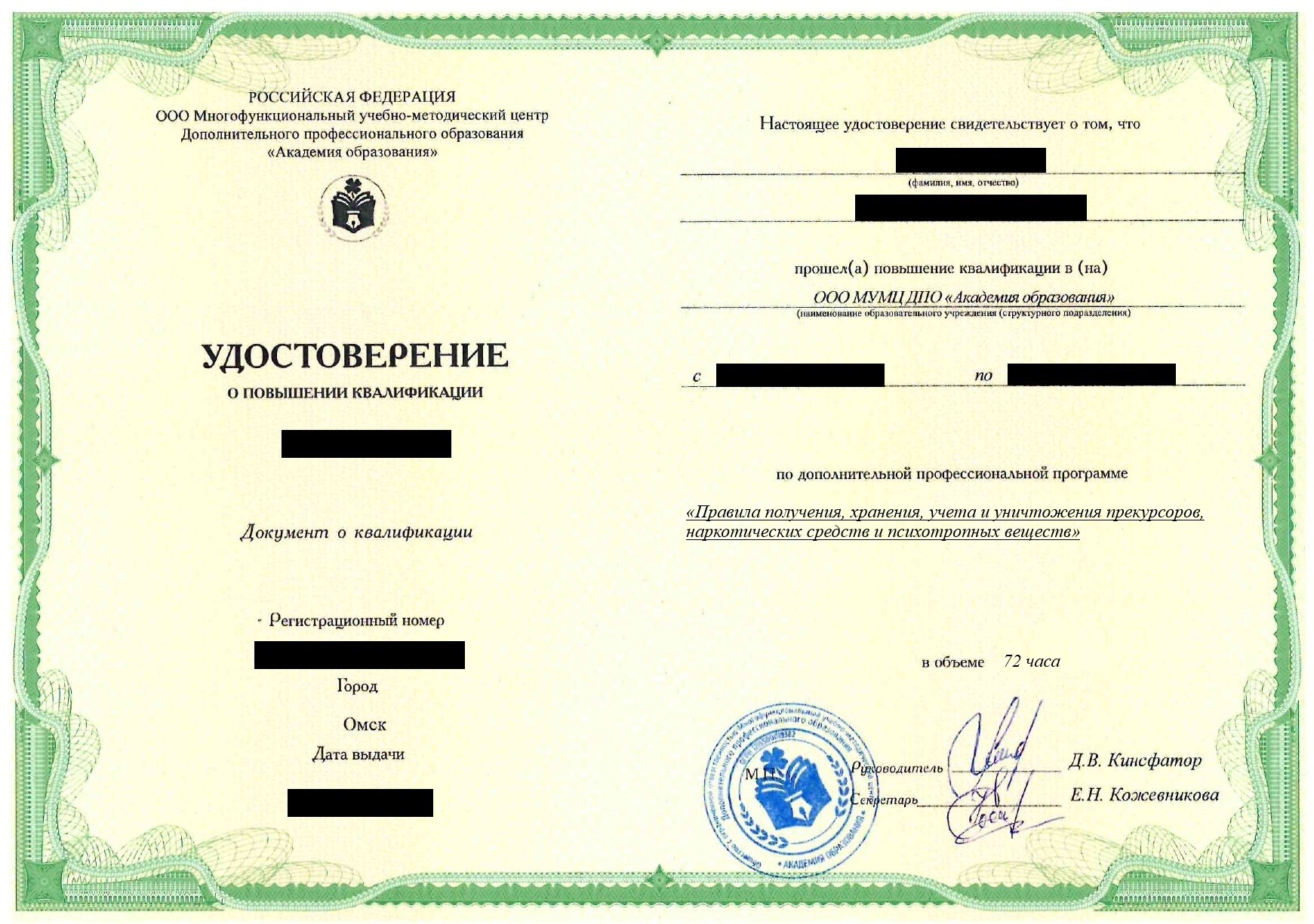 Повышение квалификации правила получения, хранения, учета и уничтожения прекурсоров, наркотических средств и психотропных веществ в Омске